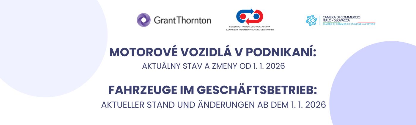 | Motorové vozidlá v podnikaní: Aktuálny stav a zmeny od 1. 1. 2026 | ONLINE WEBINÁR - v slovenčine | 19.11.2025 09:00 |